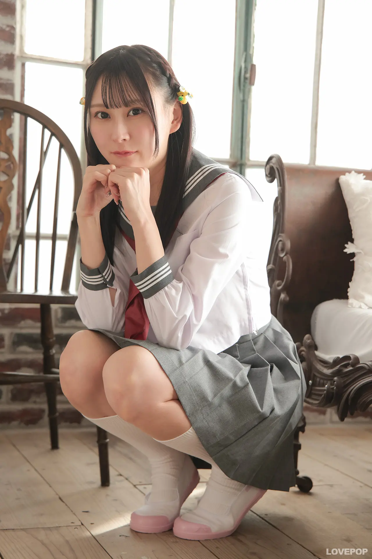 窓辺から差し込む光で透けるプリーツスカートからの太ももやお尻のラインが美しい。