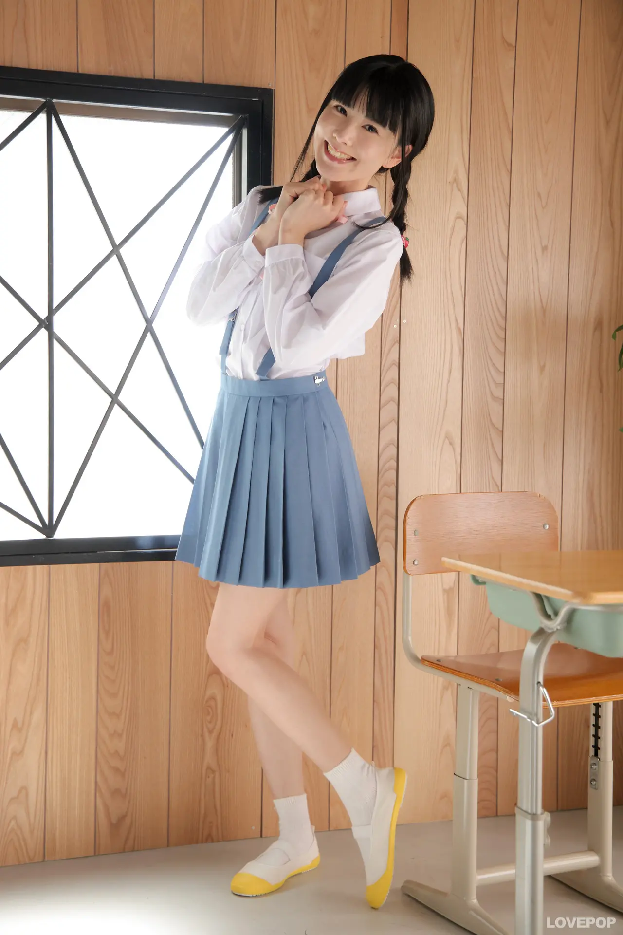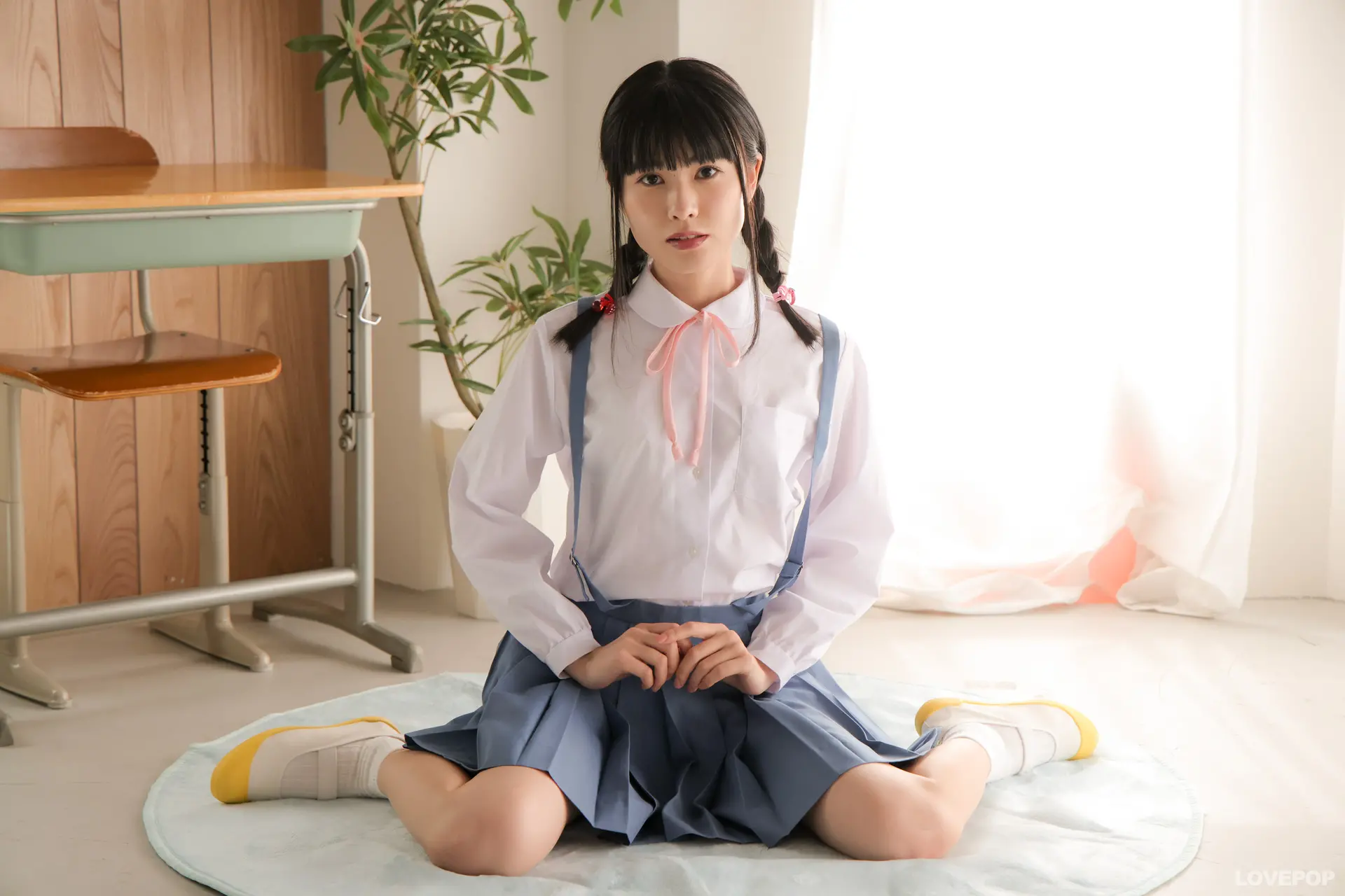 黒髪を三つ編み二つおさげにして制服吊りスカート姿の樋園綾佳ちゃん♪