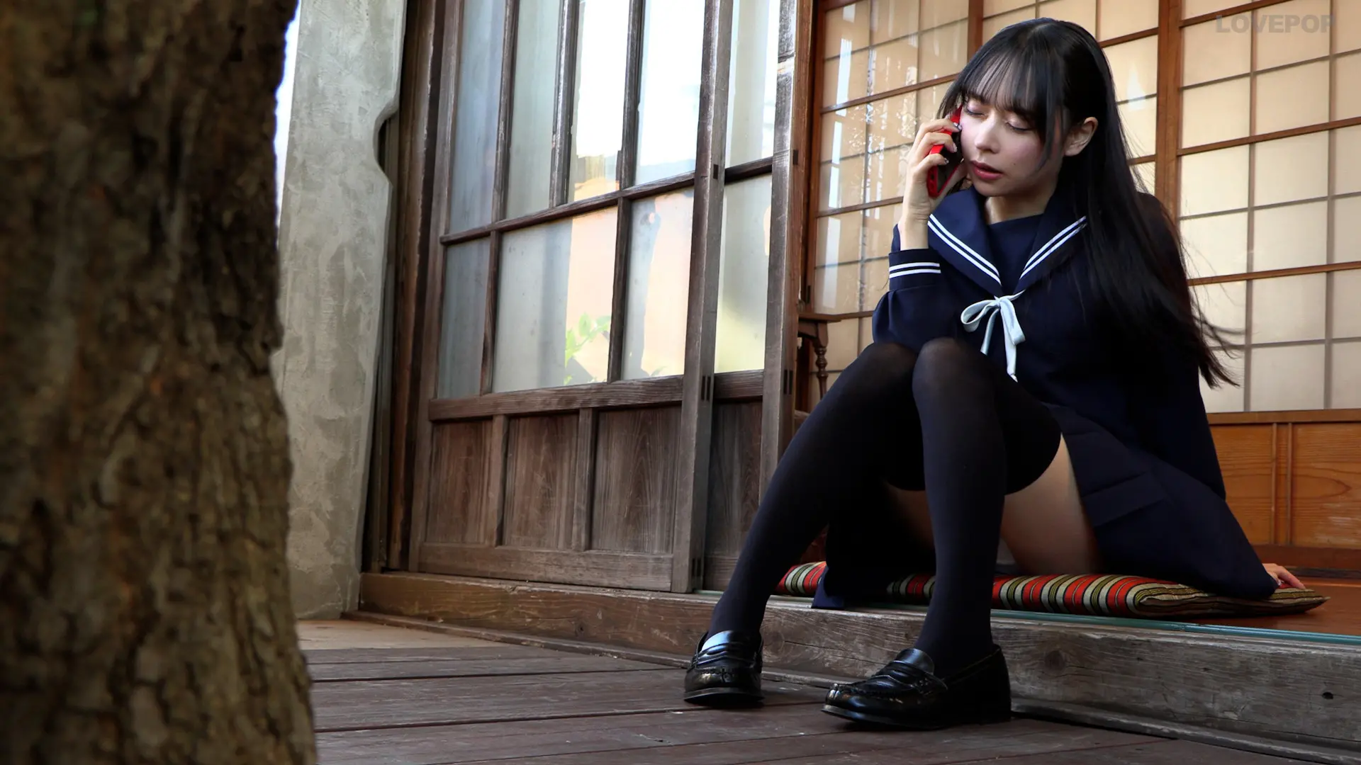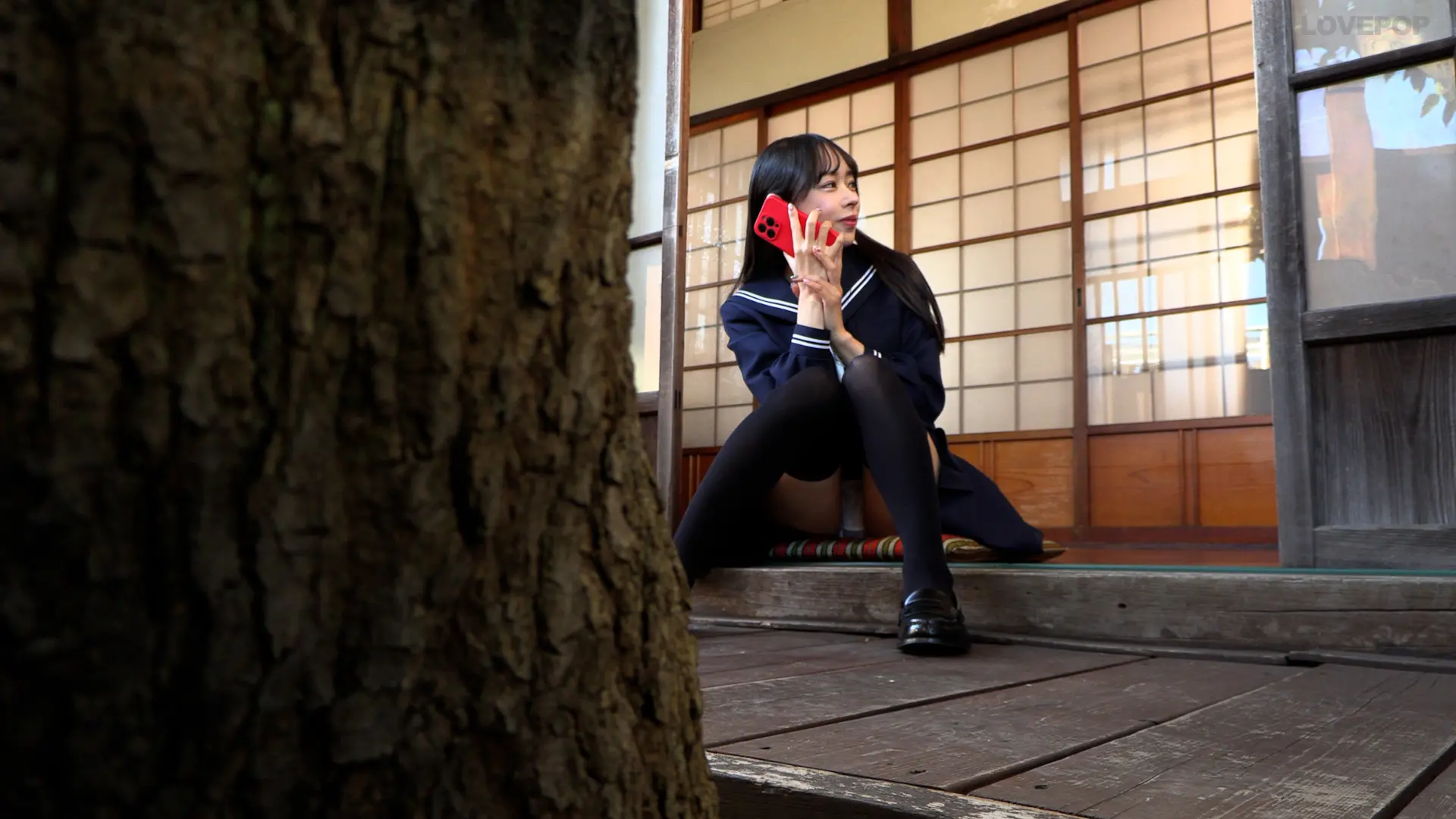 縁側でお友達と楽しそうに電話をする様子や、