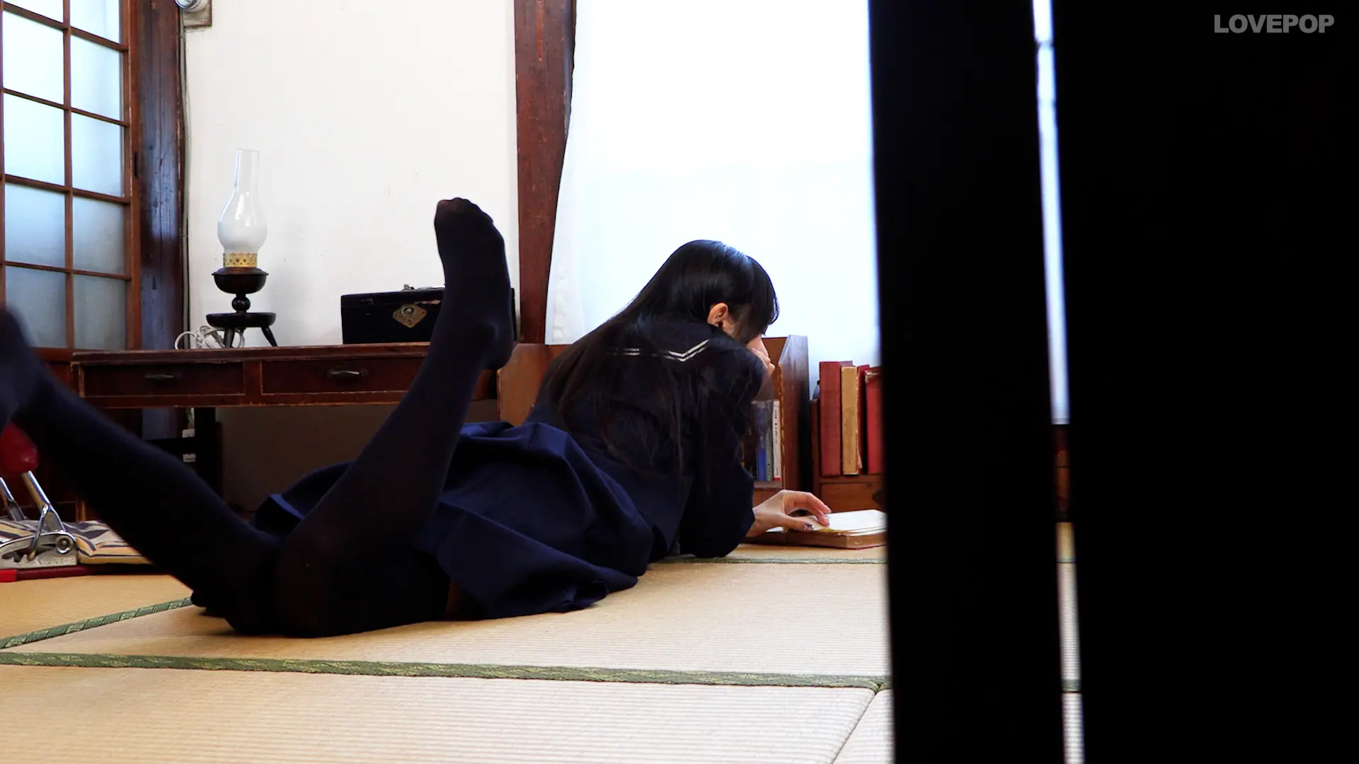 畳のお部屋でごろごろしながら勉強する姿、
