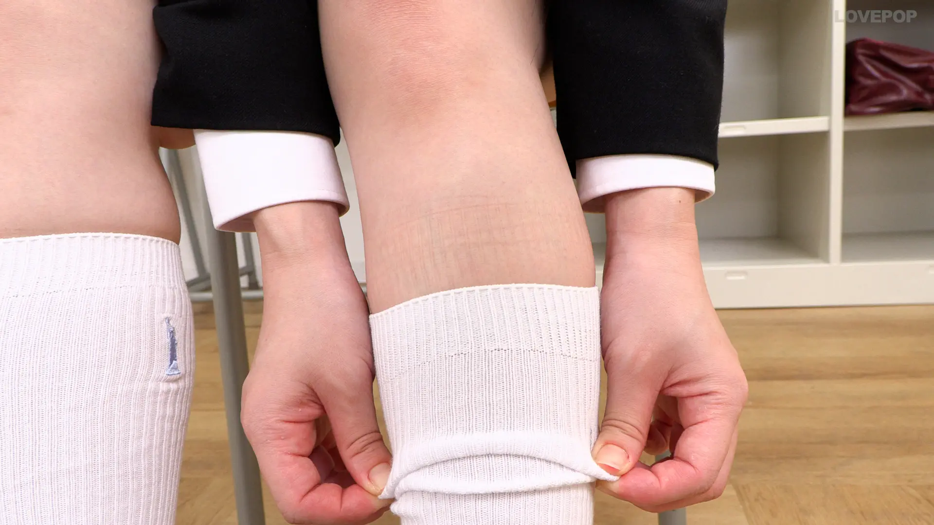 しゃがぱん、ハイソックス脱ぎ、素足も含めた脚フェチ動画です。