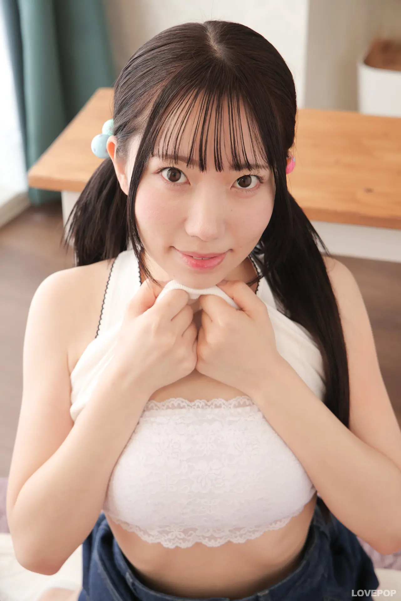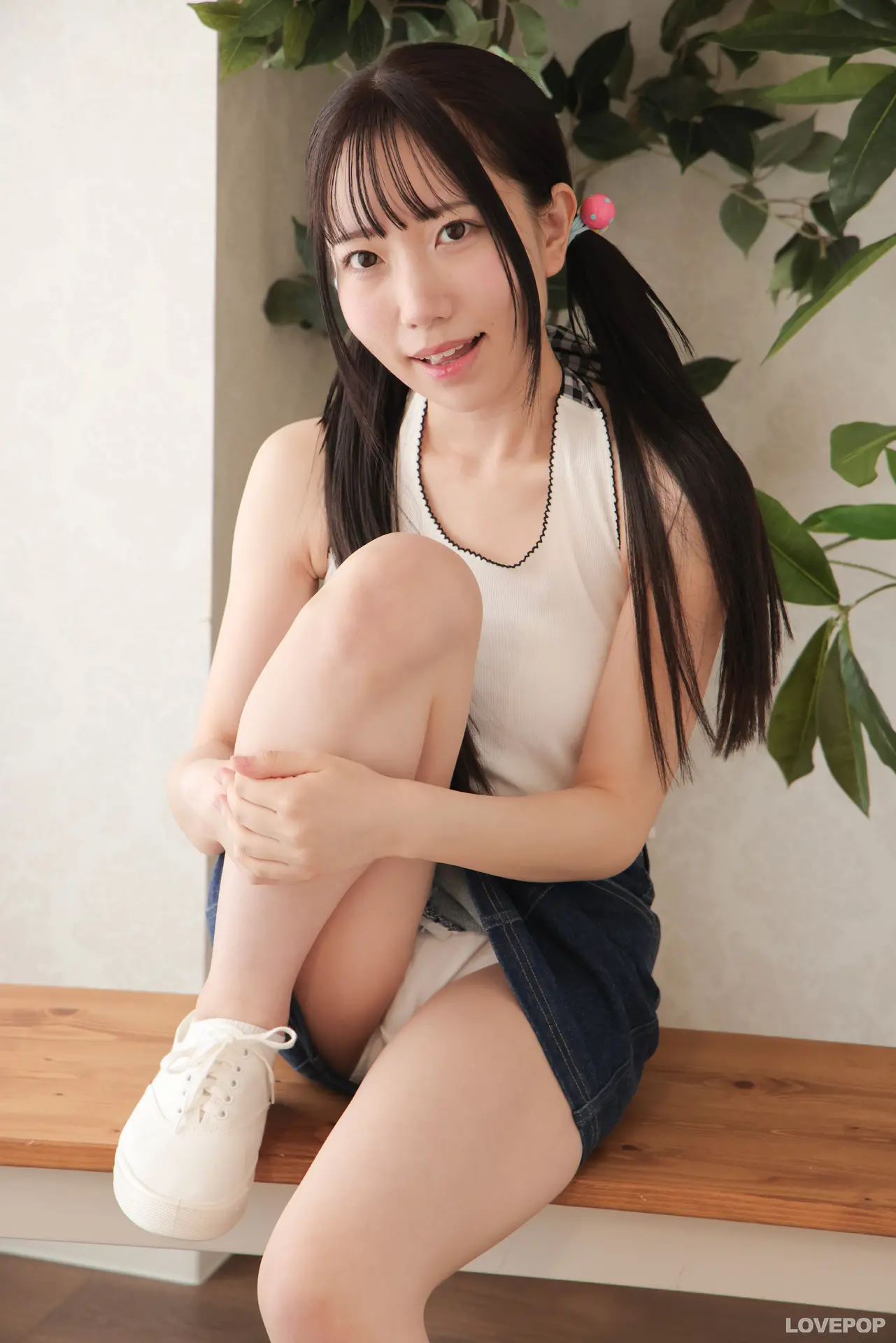 陽菜乃ちゃんの黒髪が、デニムスカートの淡い色合いと揺れながら小柄なシルエットを優しく包む。