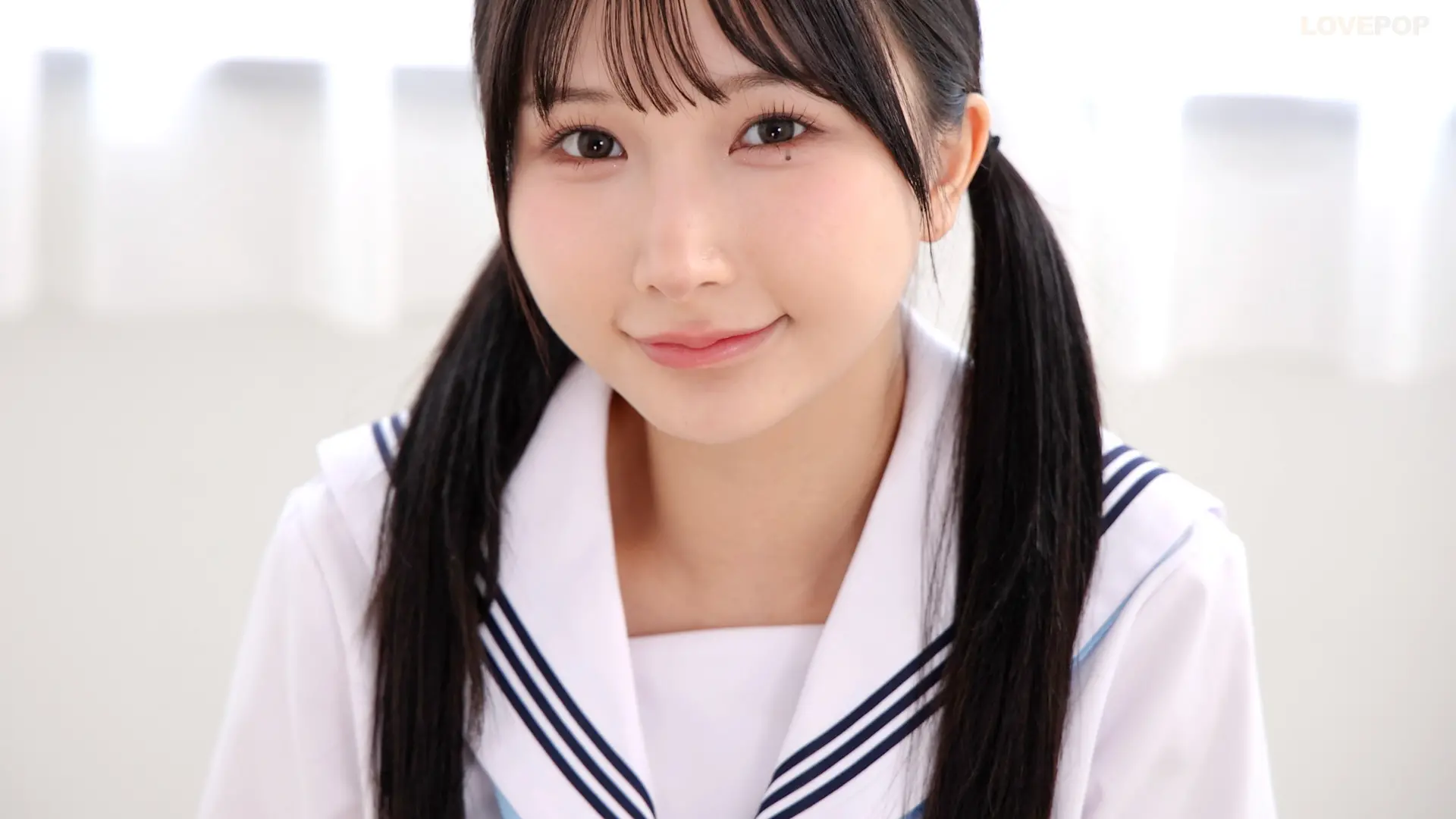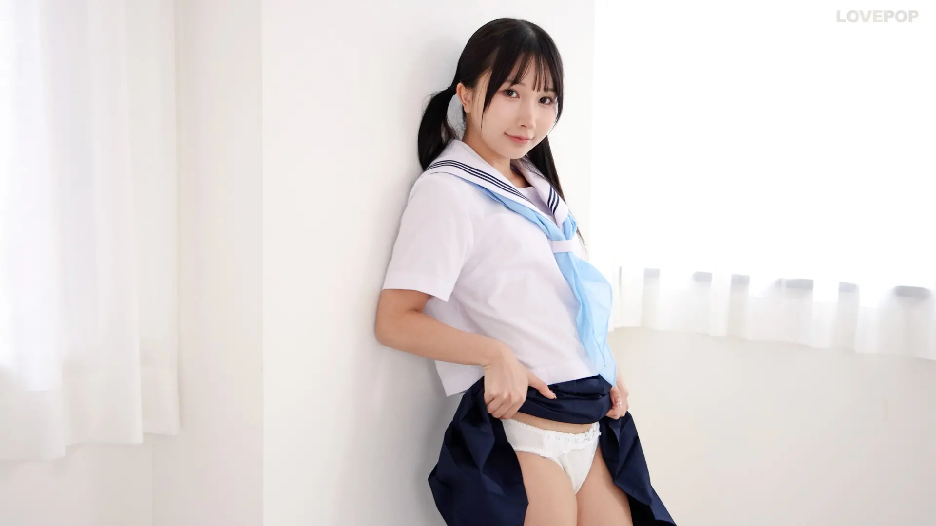 自然光差し込む白い部屋に、爽やかなセーラー服の由良かなちゃん。